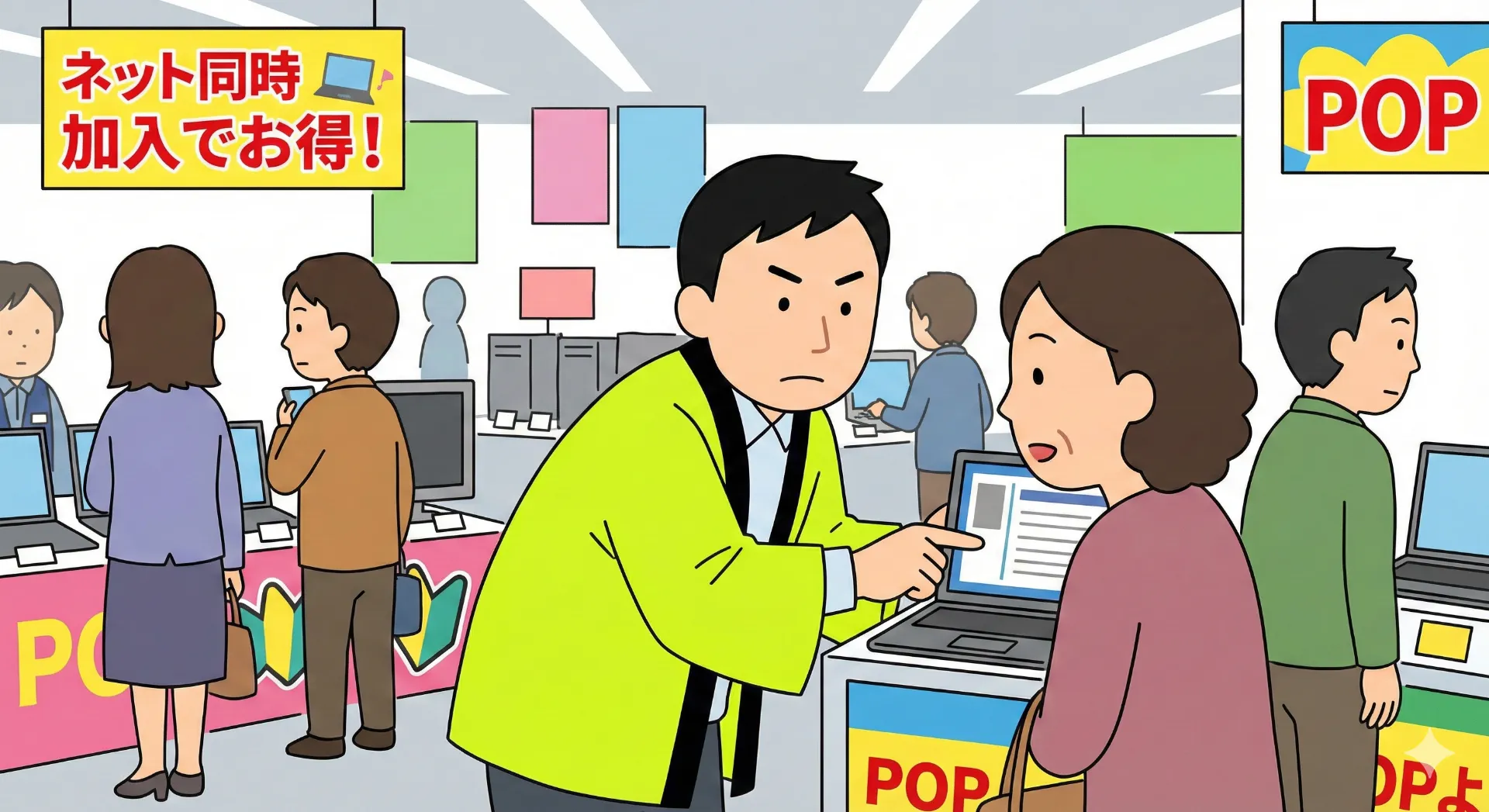 仕事の内容は、単に風船やティッシュを配るだけではありませんでした。 売り場でお客様に声をかけ、パソコンや家電の商品案内をしつつ、「今ならネットも一緒に申し込むとお安くなりますよ」と契約に繋げるのがミッションです。