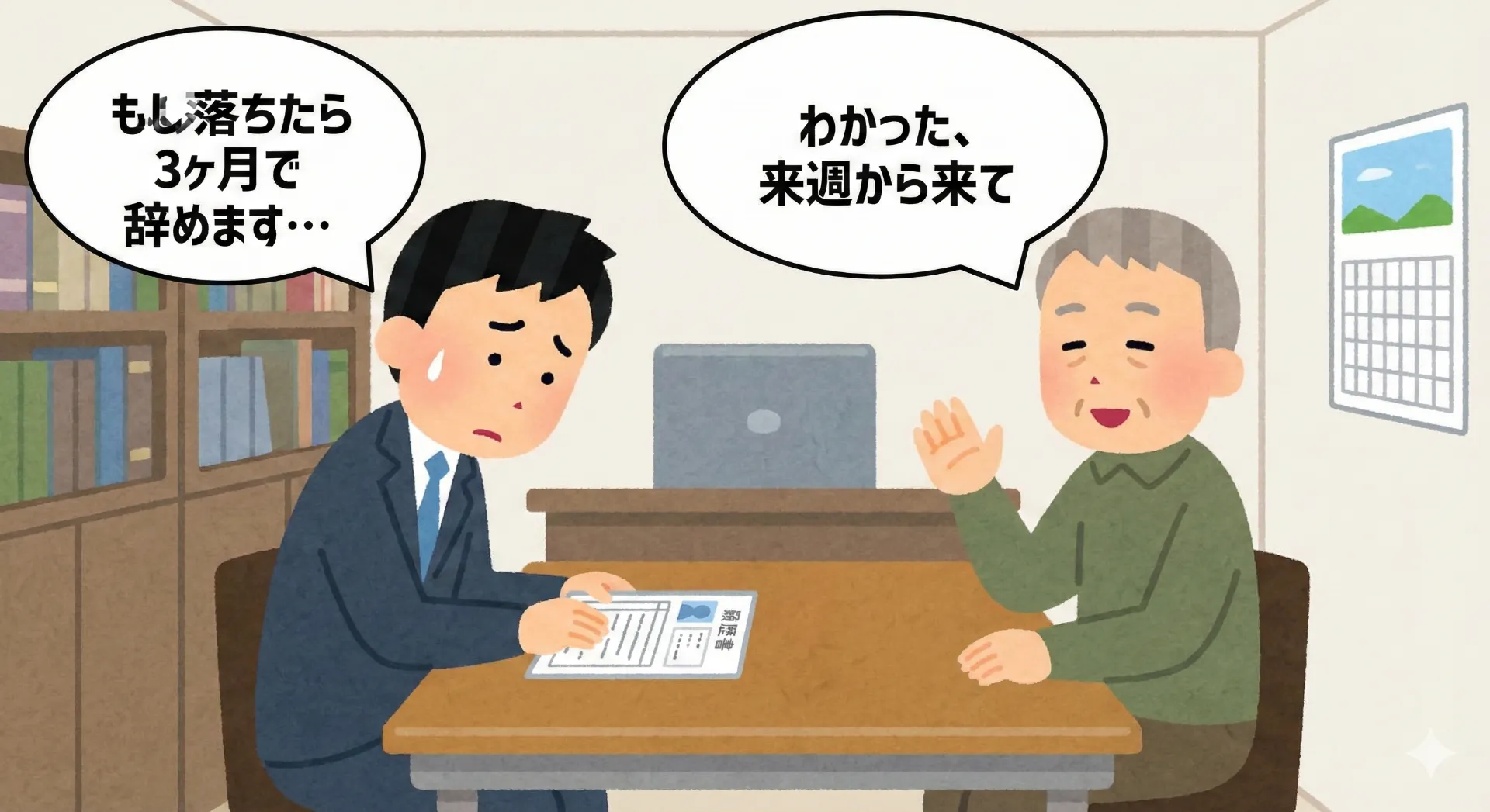 「えっ?」 耳を疑いました。 「いや、でも、もし落ちてたらすぐ辞めるんですよ?」 「その時はその時や。受かるつもりでやっとるんやろ? ほな、受かる前提で採用するわ」