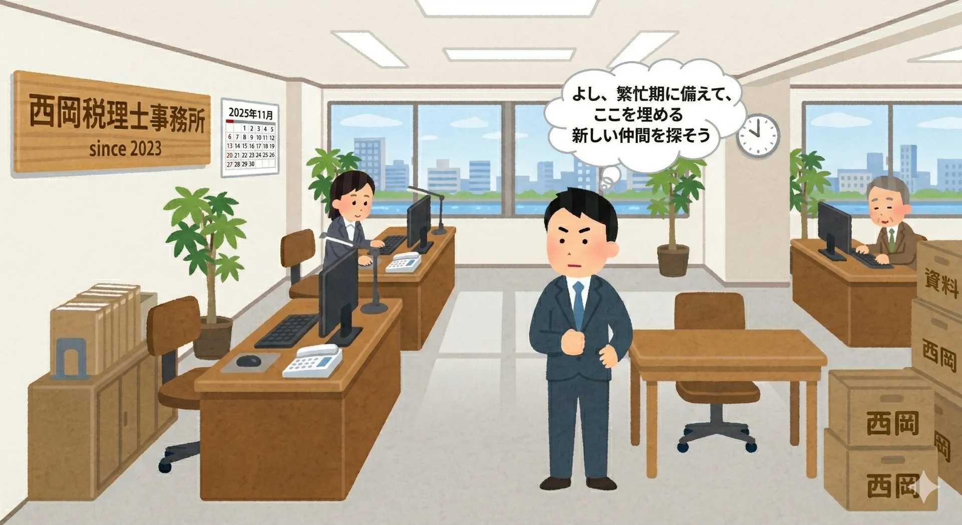 そう、来年(2026年)の春には、またあの恐ろしい確定申告シーズンがやってきます。 顧問先も順調に増えている今、この広いスペースを活かして、新しい仲間を迎え入れなければなりません。